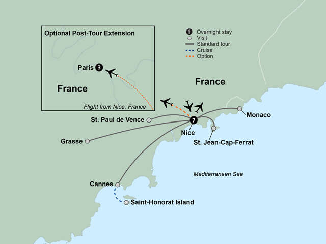 It’s time to live the good life and embark on a getaway to the fabulous French Riviera, or Côte d'Azur. With its elegant coastal resorts, superb eateries, chic boutiques and captivating museums, it’s the ultimate sunny retreat for the elite. Unpack your bags just once and stay at a single hotel for your entire adventure, which begins with an overnight flight to France.